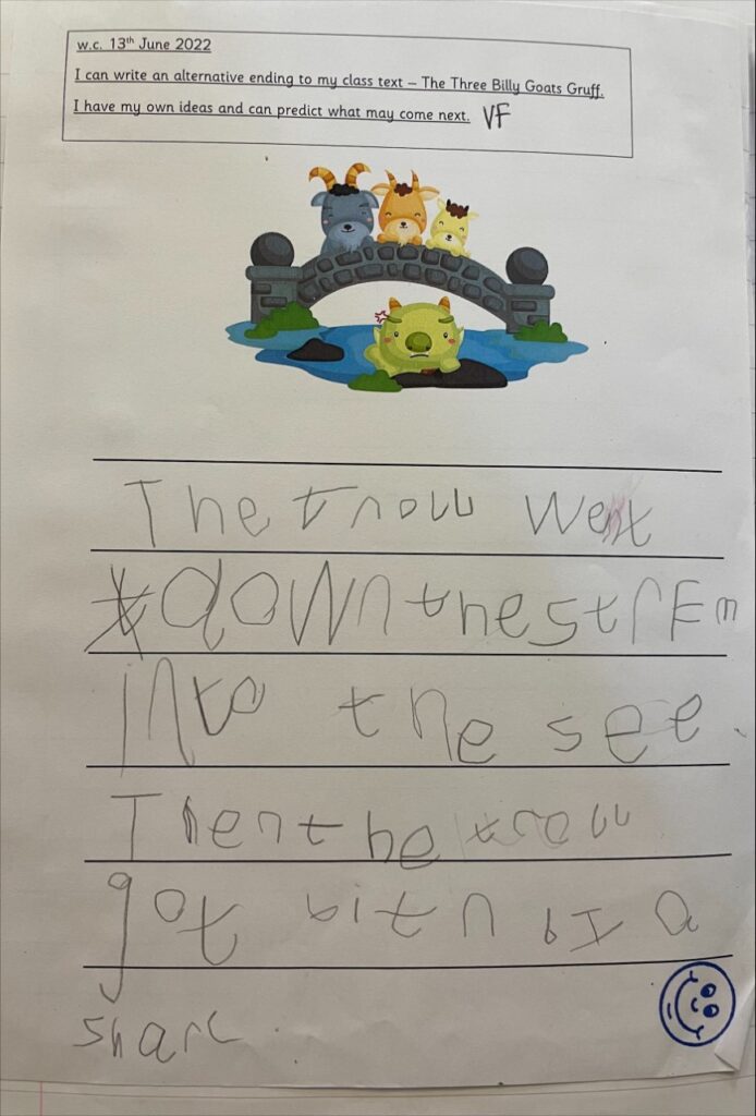 This term, reception class have worked on 2 aspects of writing. Firstly, the children have been encouraged to use their phonics knowledge and skills to write with greater independence. As a result, they have developed confidence in their own ability. Secondly, reception class have been developing their writing skills and ability by learning about the different ways we can structure words. This has included writing simple sentences, descriptive sentences as well as writing lists. English work has been linked to focus stories and tasks, therefore the children have wrote about the Queen as part of our jubilee celebrations as well as the stories of The 3 Billy Goats Gruff and Aliens Love Underpants. This has also helped in supporting and consolidating children’s knowledge and understanding on these topics/stories.